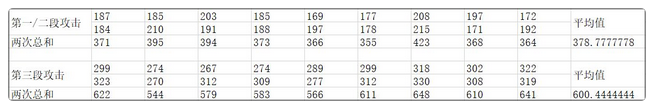 攻击方式上,双刀一共有三段攻击,第一段和第二段相同,第三段为第一段数值的1.5倍(这是小批量数据测试而来的,可能有不准确,测试数值如下图):