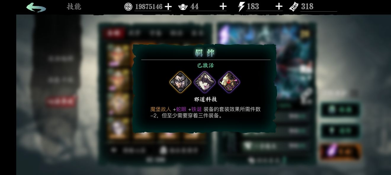 由魔堡故人+蛇眼+铁诞组成,其羁绊效果前期无用,后期必备,毕业必选,升华为邪道科技所需件数-2后与五圣祝福(衣)刻印搭配可以实现穿两件套装(除衣),有四件套装的效果;因魔堡故人心法强力的缘故,前期就可以开始培养。
