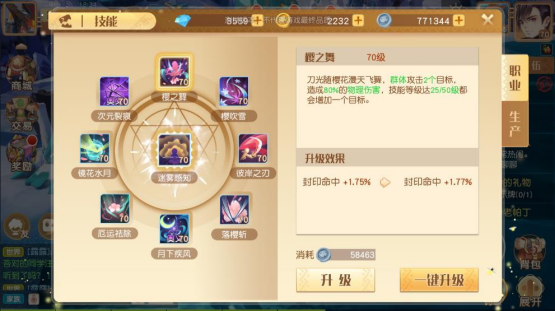 群体伤害,攻击目标 2 个造成 80%的物理伤害,技能等级达到 25/50 级会增加多一个攻击目标,升级效果增加封印效果、对影舞来说封印没有作用,纯粹的群攻技能。点评推荐:在 pve 当中适用于刷野怪任务等简单任务时默认该技能为主动技能造成高效率刷怪、伤害值群攻主伤害尚可。