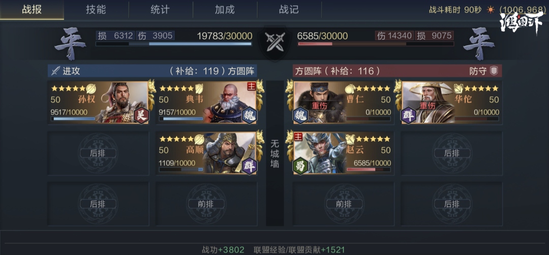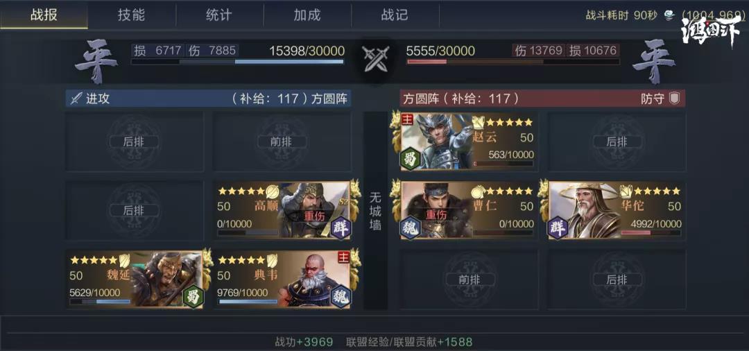 该阵容是在三势队伍的基础上演变而来,通过高顺来打乱敌方节奏,通过凌统的自带武技来为我方前排提供减伤并为典韦提供伤害加成。典韦携带合刃斗莽与酒池肉林加上陷阵强军的励军效果,尽量维持自身兵力处于己方队伍中的最高,这样即可享受凌统自带武技带来的伤害加成。