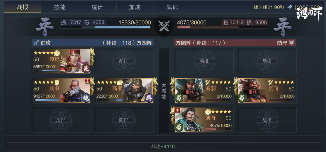 因为凌统的自带武技所附带增伤效果可能存在无法给到队伍输出核心典韦的情况,该阵容在对战拥有攻击我方后排能力的阵容时输出会略显不足。