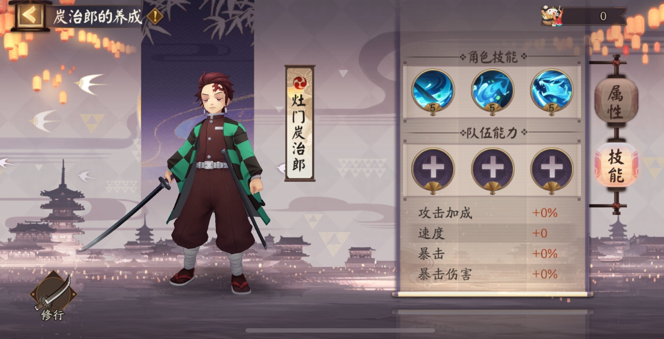 ※技能:可查看灶门炭治郎技能,配置对全队伍式神生效的被动属性与技能效果。