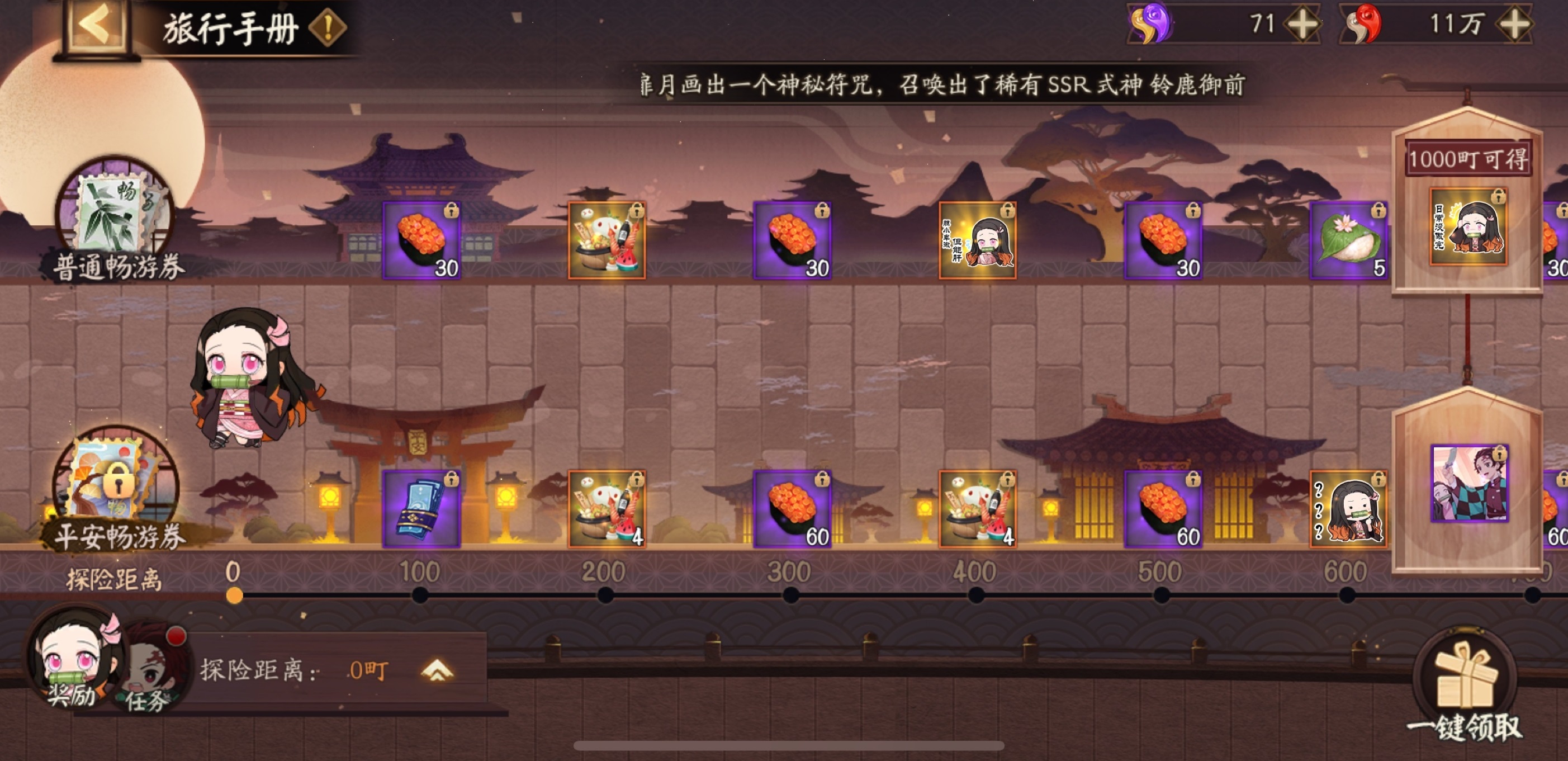※祢豆子默认持有「普通畅游券」,阴阳师大人可为其购买「平安畅游券」 ,可使祢豆子在探险过程中获得更多的宝物。