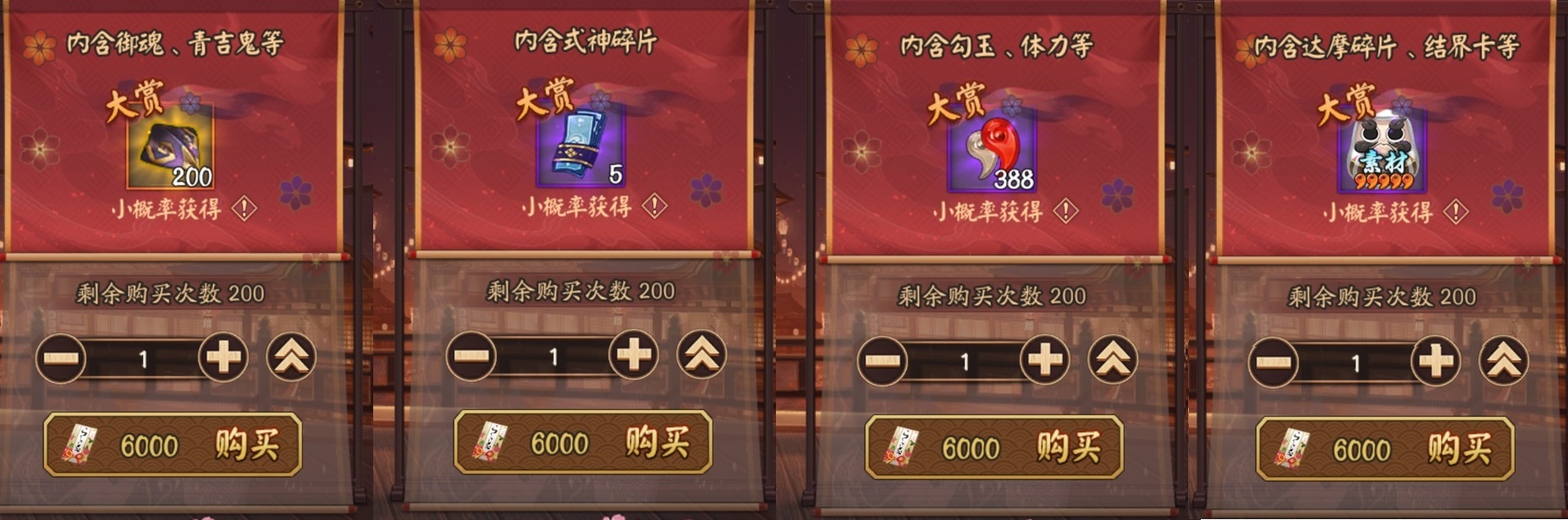 ※活动期间,可根据需要的资源倾向选择式神店长发起挑战,战斗胜利可获得对应资源。
