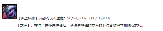 11.3版本更新最大的收益者就是小炮了,全等级技能攻速获得增强,3星更是达到90%,另一方面龙魂羁绊也是增强,现在被传递的龙魂BUFF输出特效会在传递后下次普攻触发,比之前版本减少了4次普攻的时间,直接造成目标50%最大生命值的魔法伤害。