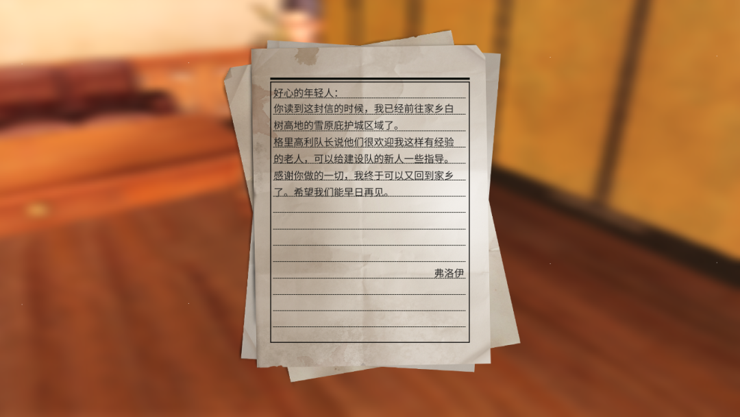 老人还留下了一封信,文字间透露着老人重返故乡的喜悦,幸存者被老人的意志所感化,被人类同心协力生存下去的伟大信念所驱动,在格里高利队长的邀请下,幸存者正式加入了庇护城建设队,助力新家园早日完工。