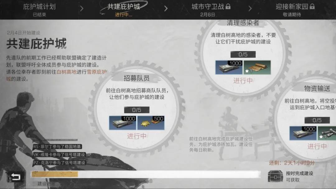幸存者需要招募5名队员加入到共建庇护城的队伍中,根据幸存者选择支援的庇护城,前往指定地点寻找队员,完成他的请求即可成功招募。