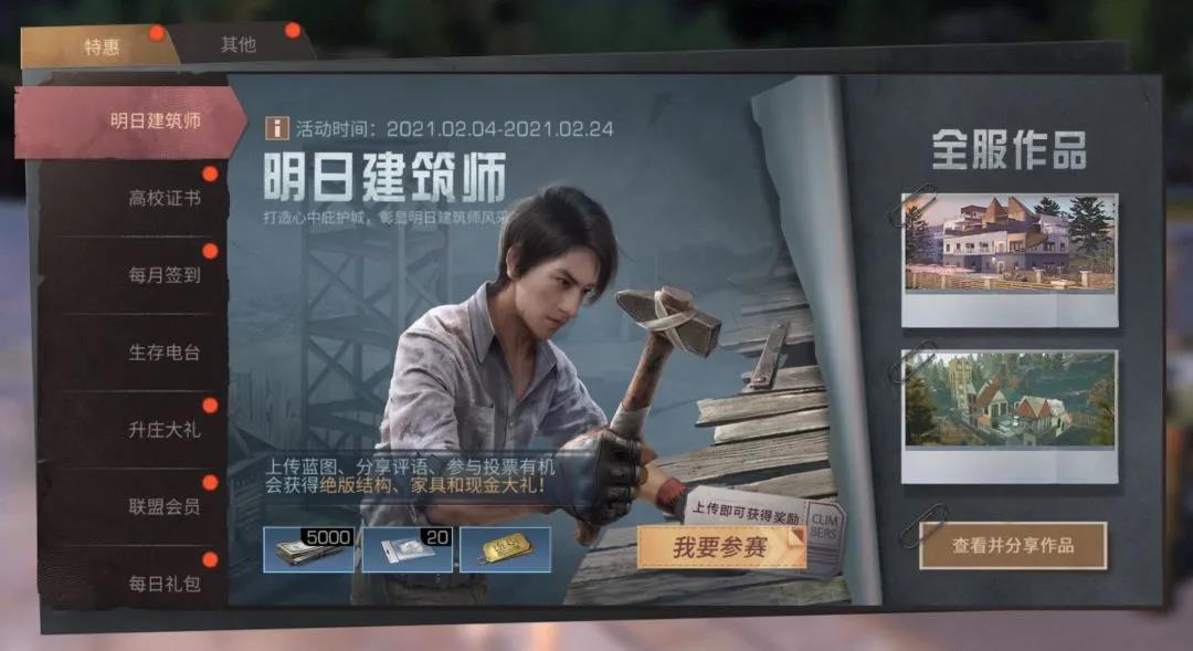2月4日~2月24日,幸存者们可通过福利明日建筑师页面,查看明日建筑师大赛相关内容。