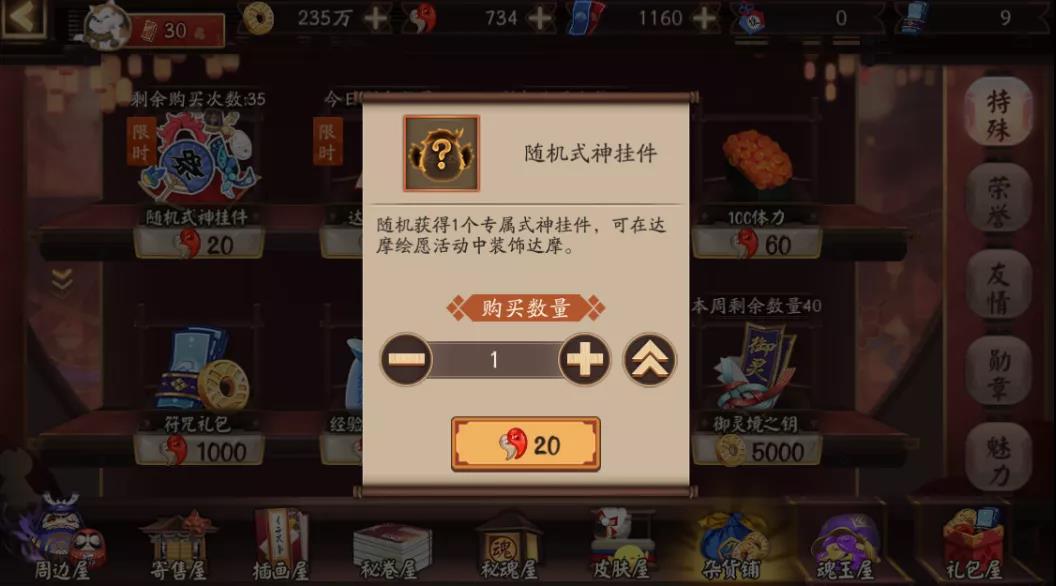 若大人想要更多的式神专属挂件,可前往杂货铺购买随机式神挂件试试运气。