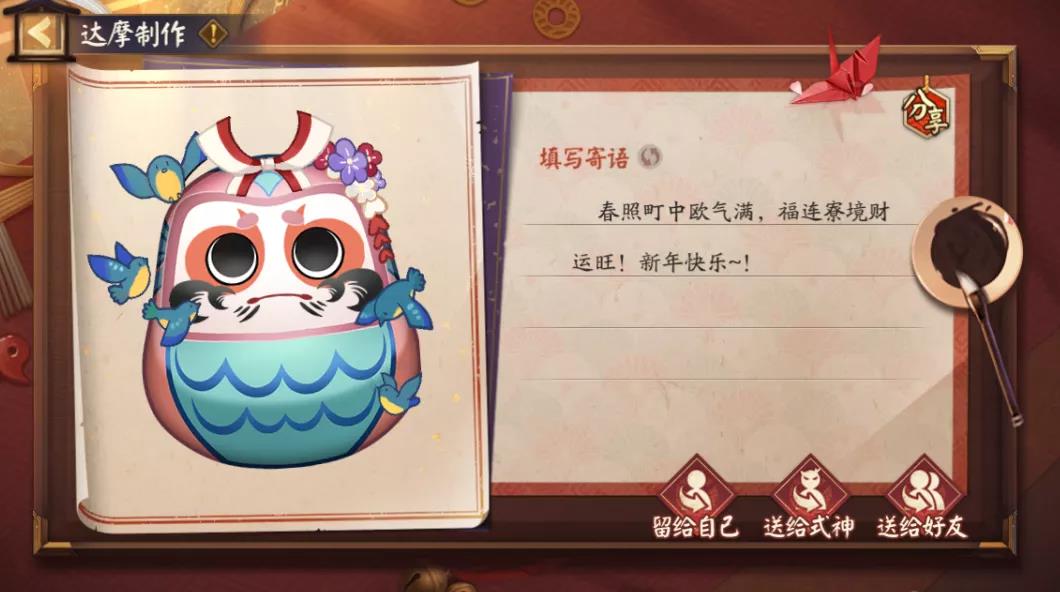 阴阳师大人在绘制达摩,寄托祝福后,可将达摩赠送给好友或者心仪式神/阴阳师。