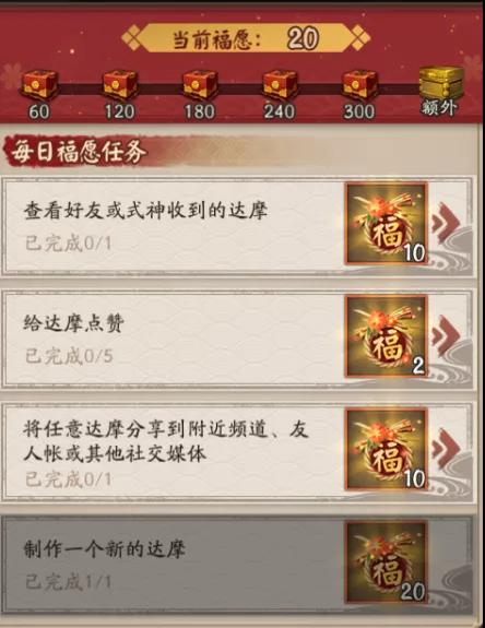 阴阳师大人每日20:00前完成任意福愿任务即可参与当日摇奖。