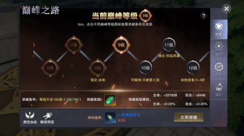 巅峰系统是全新且独立的一套等级系统,需要使用突破符文进行升级。突破符文可通过完成狮心荣耀、暴风裂隙、狮心荣耀、野外首领、个人首领和跨服首领的挑战任务获得,也可以直接在商城购买。