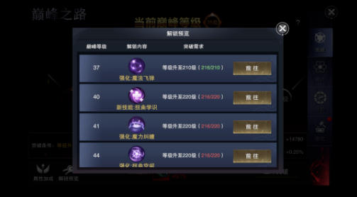 巅峰等级每提升一级,都能获得大量的固定生命值、百分比生命值、固定攻击力和百分比攻击力的属性加成。随着巅峰等级的不断提升,还可强化职业技能、解锁新的职业天赋,另外还能获得潜能石,提升巅峰潜能。