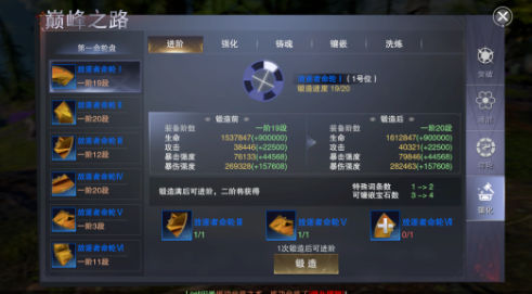 巅峰等级突破至3级,将开启巅峰装备命轮。在进行突破符文的挑战任务时,都有几率获得命轮装备。命轮共有8个装备部件,同基础装备一样,可增加玩家生命值、攻击力、防御力、暴击爆伤、免暴抗暴、格挡和双方解除等属性。