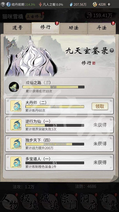 玩家们只有兼顾修炼年数、炼器进度、炼丹进度、种植进度、灵兽等级、角色战力等养成方面,才能解锁更高等级的修行成就。