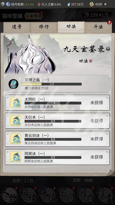 玩家们只有兼顾长生诀、太阴经、天衍术、青云剑、阴冥决等各类武功与法术,才能解锁更高等级的功法成就。