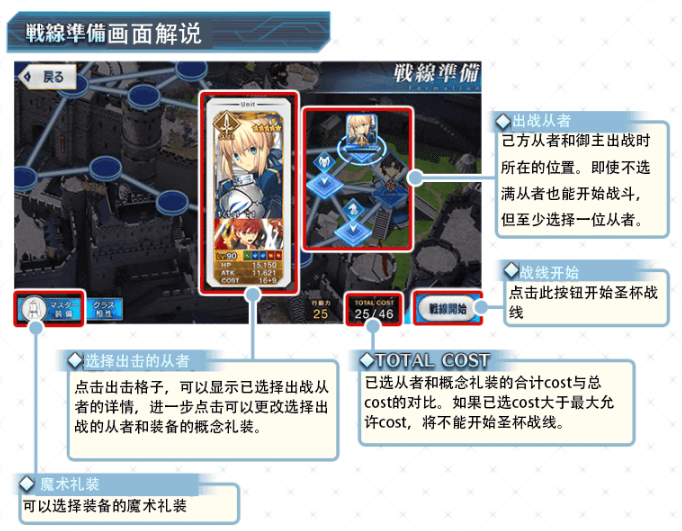 注1:点击有职阶标记的格子,就可以选择在该格出战的从者。但是能选择的,只有持有灵基中属于该职阶的从者。选择从者后,可以为其装备概念礼装。