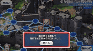 从者在受到眩晕等不能行动的状态效果时结束战斗,回到地图画面的时候仍将处于不能行动的状态。但是,在其可以行动的回合,可以消耗1次行动次数解除状态异常。