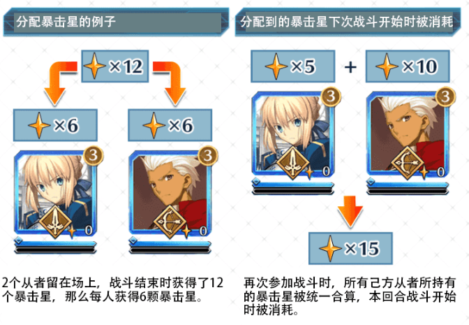 另外,参加战斗的多个从者都持有暴击星的情况下,各从者持有的暴击星的总数在下次的战斗开始时被再次分配。