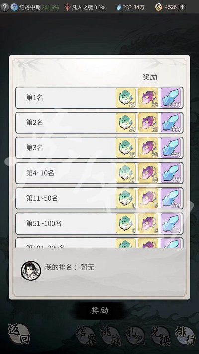 排行界面会对修士们击败妖兽的数量进行排行,修士的名称、位面和击败数将会刊登在排行榜上,前三名分别授予神功盖世、登峰造极和神乎其技徽章。