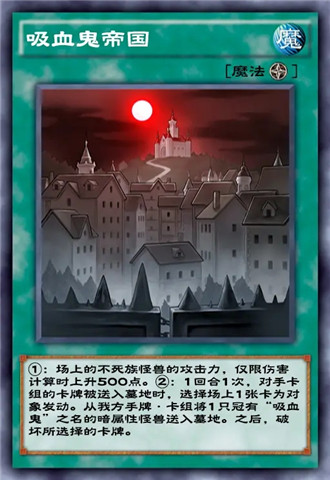 吸血鬼卡组除了「吸血鬼君主」「吸血鬼创世主」以外,还加入了「吸血鬼帝国」这一核心场地卡,以及下级怪兽,拥有1550打点的「吸血鬼淑女」(什么你说吸血鬼婴儿?加上场地才1200要你何用?)。