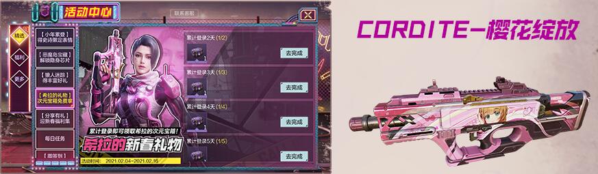 除了登录免费送,我们还特别为玩家准备了新春限时折扣6.7折。开启宝箱有机会获得史诗角色希拉一粉色小樱,史诗武器DL 033-狙击甜心,CORDITE-樱花绽放,G37-天使之心等奖励。