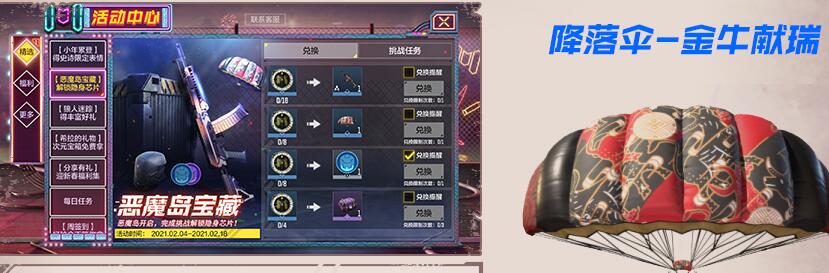 活动介绍:完成新玩法恶魔岛的挑战任务,即可解锁隐身芯片,更可获得AK117-青铜箭头、降落伞-金牛献瑞等海量好礼!这么好看的降落伞,你不会不想要吧?