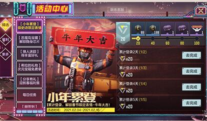 活动介绍:从2月4号小年开始,累计登录5天,即可获得牛年限定史诗表情-牛年大吉。新春佳节,鸿运当头。使命相见,牛年大吉!
