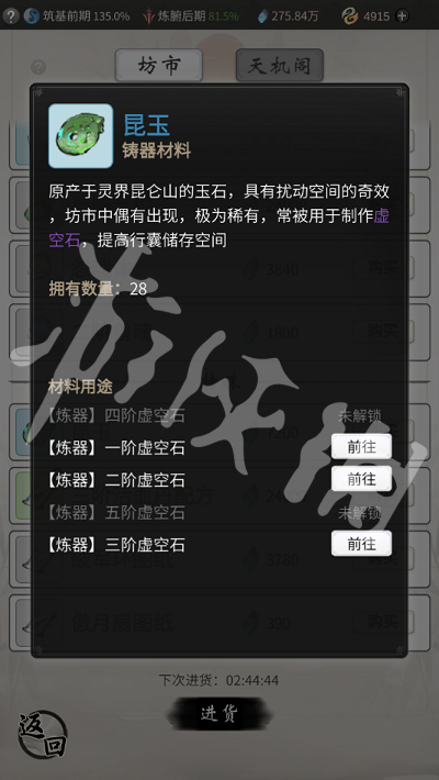 在坊市中优先购买昆玉,可用于制作提升背包容量的道具。