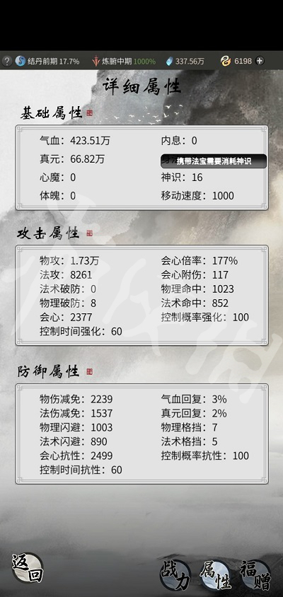 神识:携带法宝需要消耗一定的神识。神识能够影响当前可装备的法宝数量,当修士处于元婴/元武后期可达到最高装备量为6个。