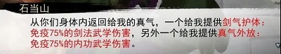 石当山拥有三个Buff:剑气护体(受到剑法攻击减伤75%)、真气外放(受到内功攻击减伤75%)、致命克星(受到如意宫和宇文庄武学将会额外增伤25%)。