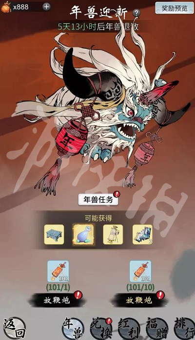 2、仙友在活动页可使用【鞭炮】攻打年兽。每次攻打年兽,都会有机会获得高阶星尘宝箱、研习心得、神品饲灵丸、探宝令等高阶奖励,同时还会额外获得【五福】道具!
