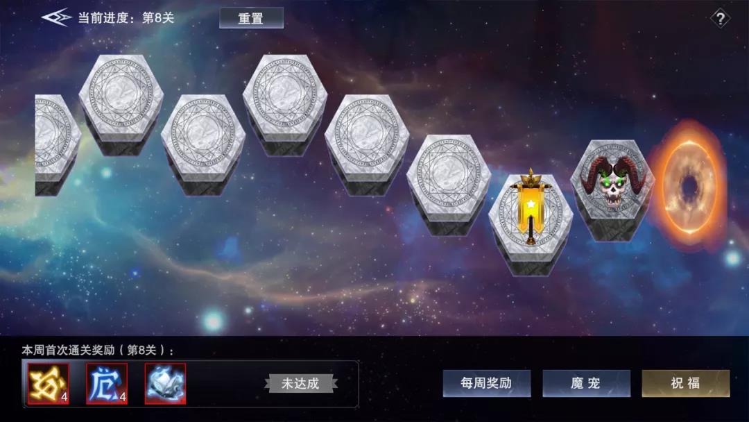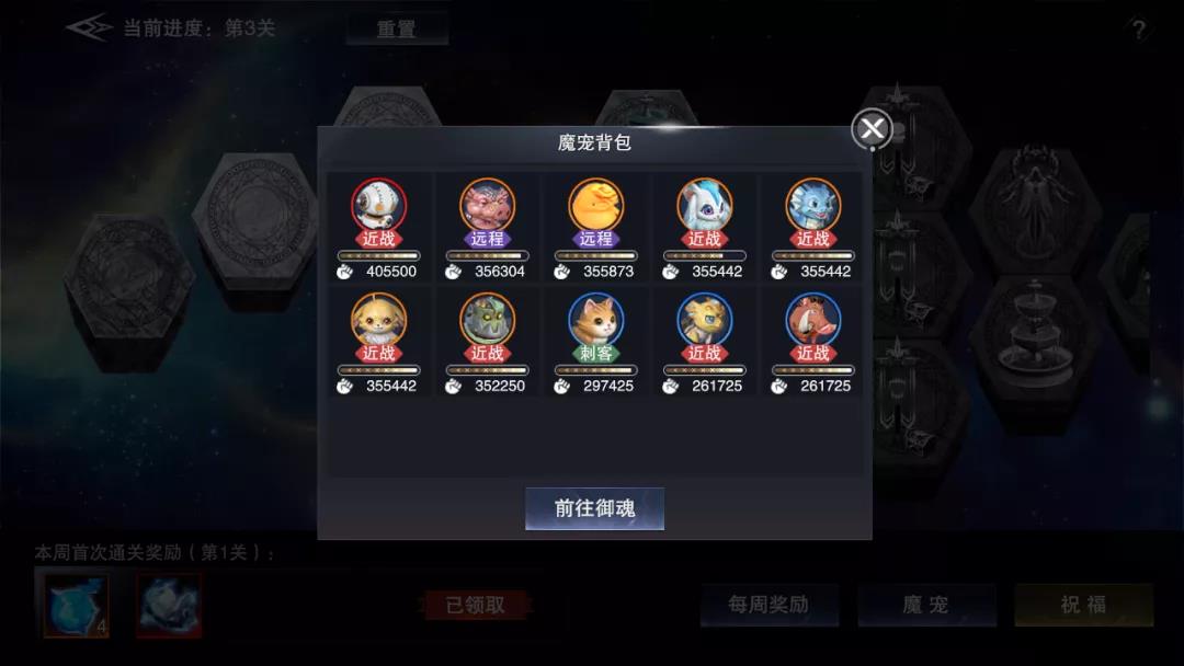 在魔宠远征每周挑战中,我们需要面对由易到难的五层大关卡,每一层的大关卡中,随机分布着八个小关卡。根据每周通过的关卡数量与层数,可以解锁不同档次的道具奖励,获得御魂卷轴、通灵卷轴等材料,加快自己魔宠养成的进度。