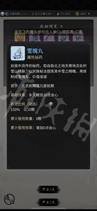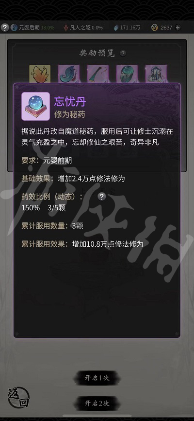 连续使用多颗还能提升药效。忘忧丹的开出率高达7.1%。