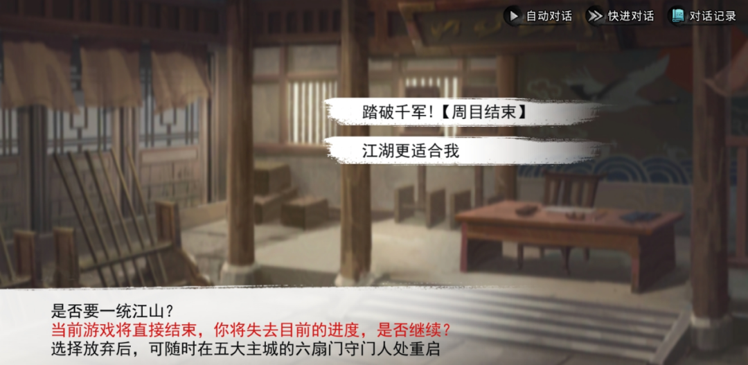 大侠游历江湖地图上每个地点的所有区域后,即可前往太湖凡云庄的易龙处,选择退隐江湖。