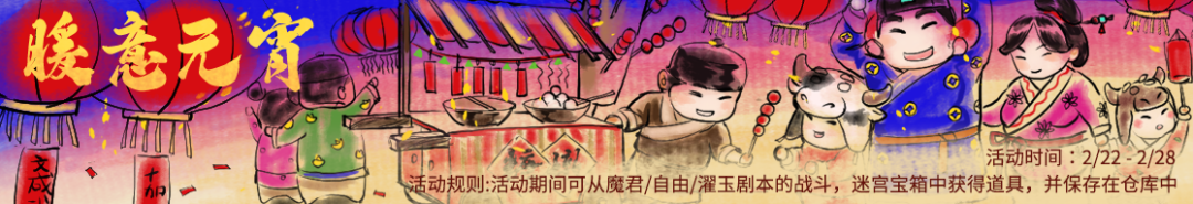 活动期间,大侠们可从《江湖濯玉录》剧本、《魔君乱江湖》剧本或自由模式中,通过战斗和开启迷宫宝箱的方式,获得活动道具花灯、汤圆、灯谜。