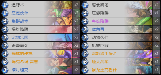 以下是炉石传说玩家Orange分享的雷管猎卡组: