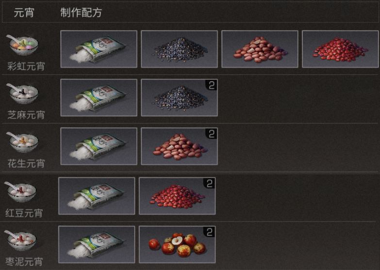 元宵食材配合面粉,可以在烹饪炉上制作出美味的元宵,不同元宵有不同的效果,快去尝试吧。