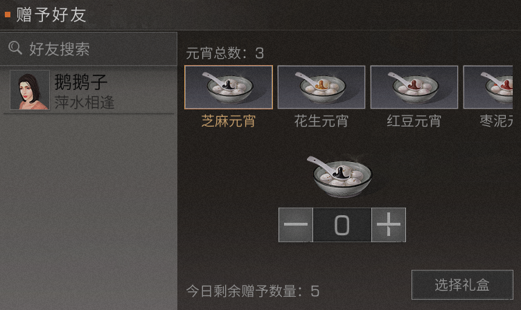 制作出来的元宵可以赠予好友,每次赠予可获得元宵精致礼盒*1(打开后可随机获得配方残页*20、护甲材料lv1*1、元宵团子*10以及稀有限时称号元宵达人)、新币*2000。