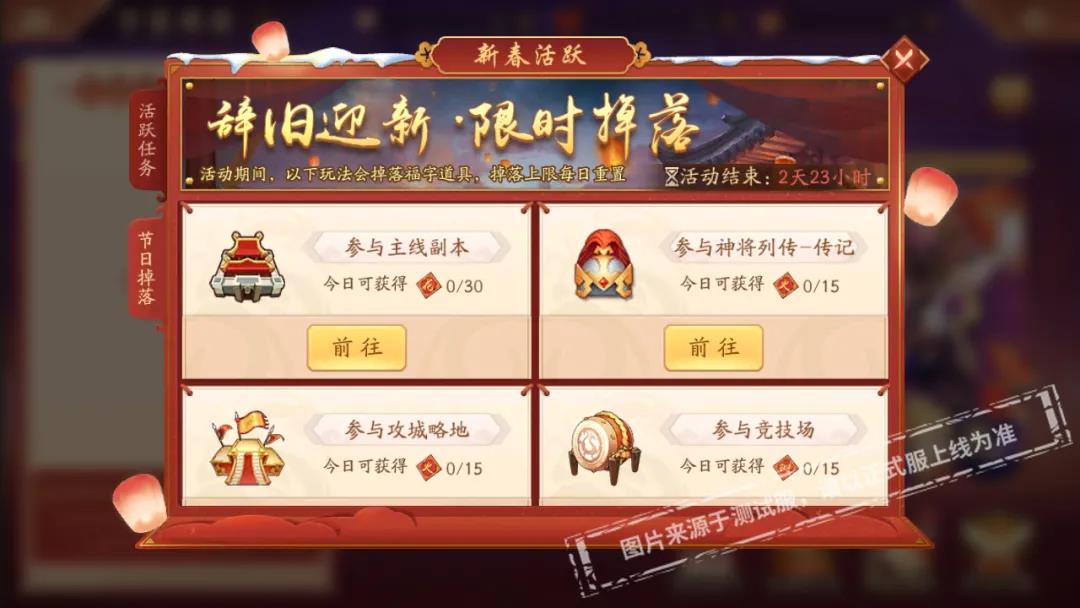 少年在万家团圆活动中参与各种玩法可以获得军团鸿运值,军团所有成员获得军团鸿运值可以用于争夺军团排行,最终上榜军团的所有军团成员均可获得排行大奖。