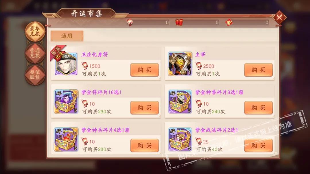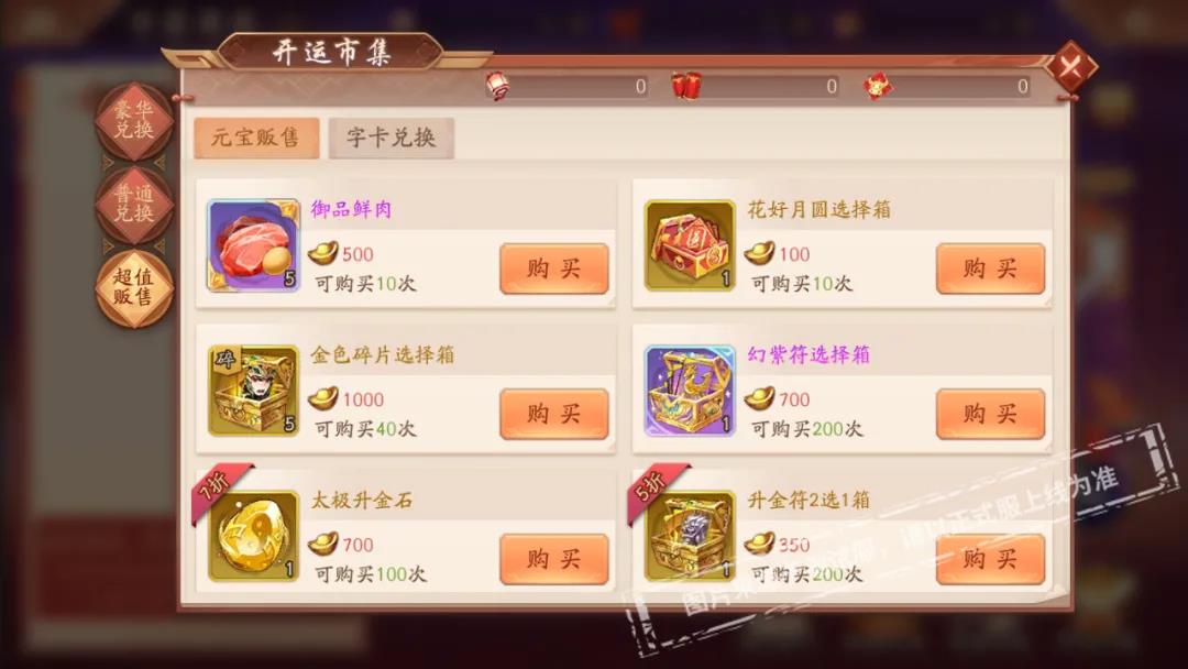 活动期间,少年们消耗元宝可购买一定数量的御品鲜肉、花好月圆选择箱、金色碎片选择箱、幻紫符选择箱、金色命星选择箱(20选1)等稀有奖励,此外还可以超低折扣购买全红将碎片箱、红装碎片选择箱、红色神兵碎片选择箱等实用资源,低至三折,不要错过哦~