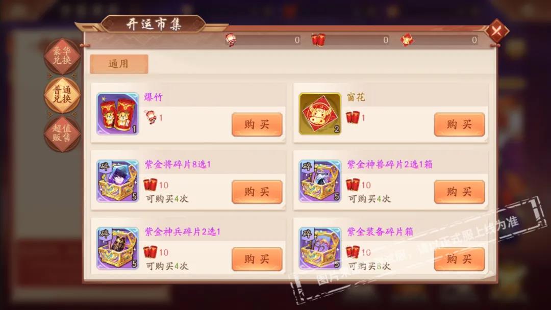 爆竹可兑换紫金将碎片8选1、紫金神兽碎片2选1、紫金神兵碎片2选1、紫金装备碎片箱、八卦幻紫石、幻紫符选择箱等珍稀道具。