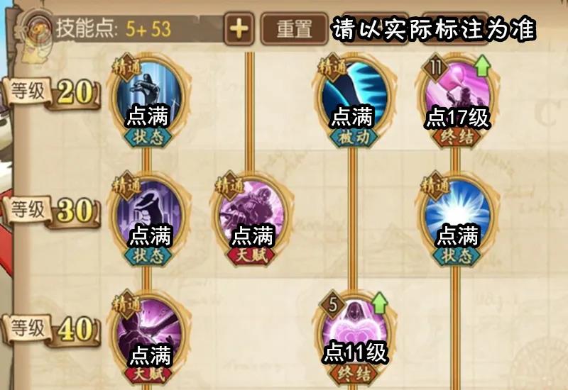 主打伤害的终结技【虏之矢】这里点了个17级,有300%的爆伤提升,还算不错。另一个终结技我们点了11级,备用即可,现在单一的搭配有时候难以应对多变的情况,所以能备用还是备用一下。