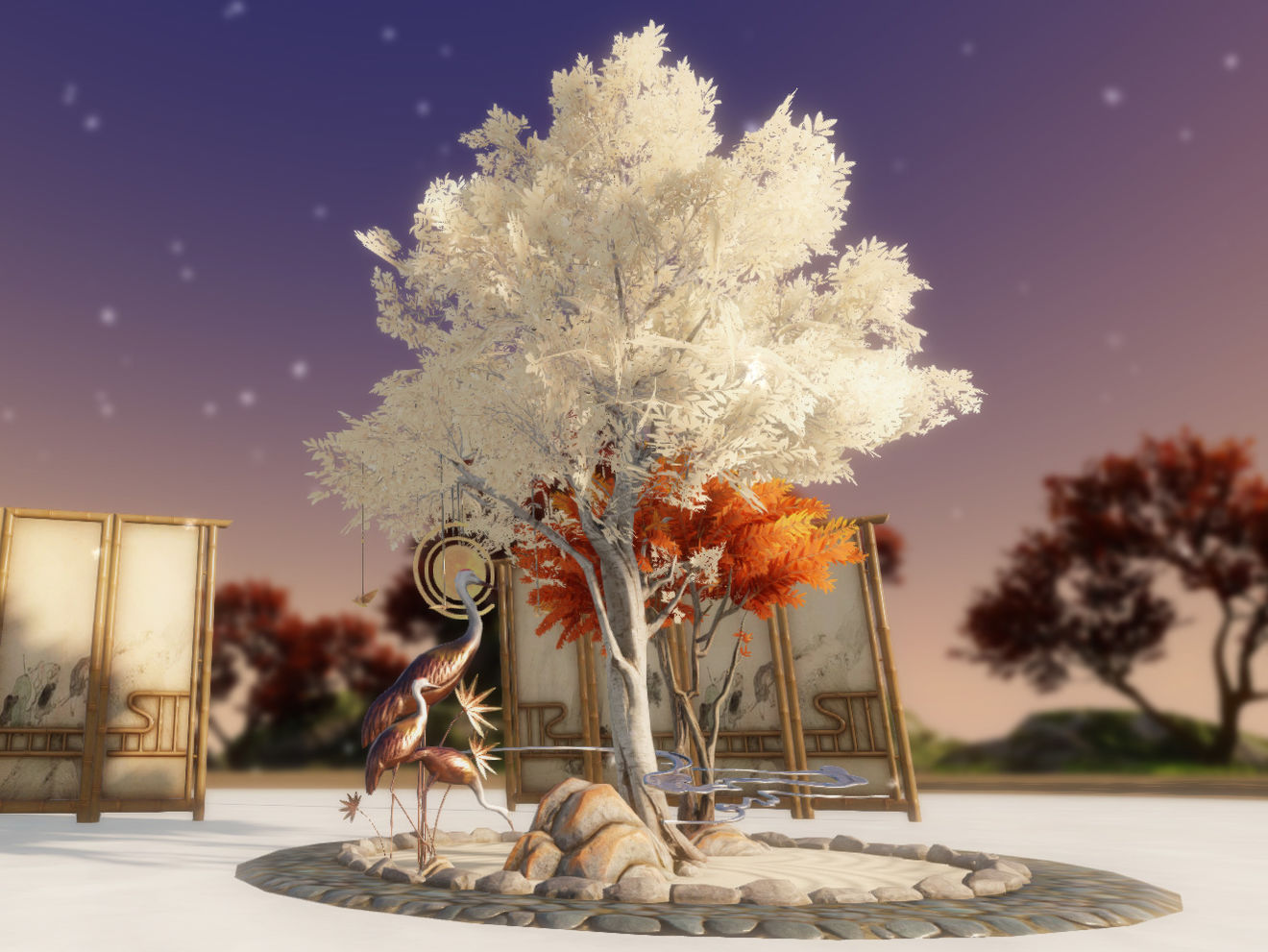 营造司后院栽种月桂,其叶亦绯亦金,清雅芳香,颇得来客赞赏。大师傅特制皓月灯照之,树下又有鹤三两,身姿翩跹,胜似仙境。