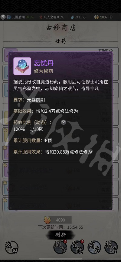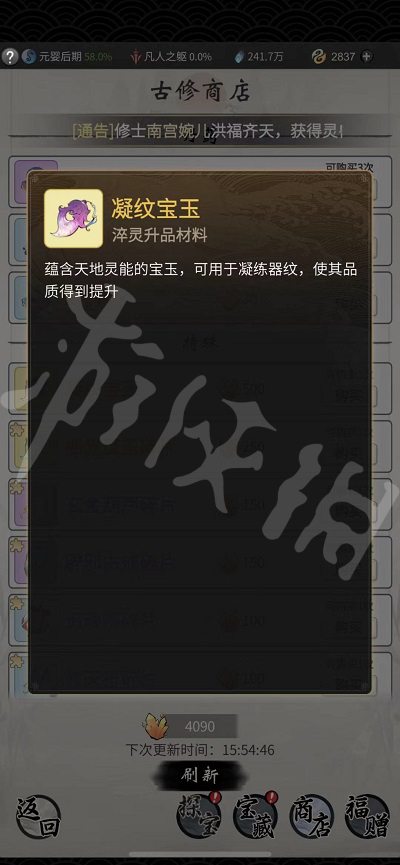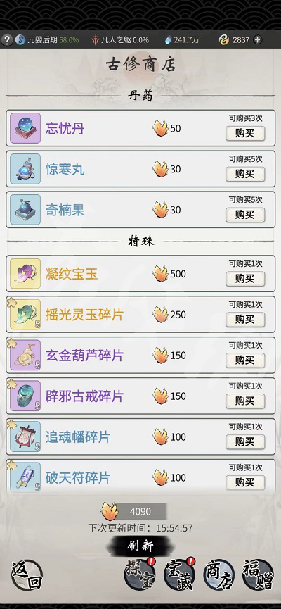 当我们需要丹药时不妨来这看看,当我们积累较多天机石后可以将完整宝玉带走,当我们想要一件古宝时可以选择相应碎片进行购买。