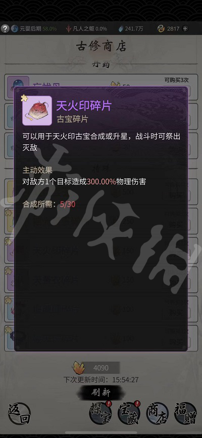 天火印碎片:售价150天机石,每日限量购买1次。天火印碎片同样隶属于古宝碎片类型,可以用于天火印古宝的合成或升星,在战斗过程中有助于祭出天敌。天火印拥有主动效果,能够对敌方单个目标造成300%的物理伤害。合成完整的天火印碎片需要30个相应碎片。