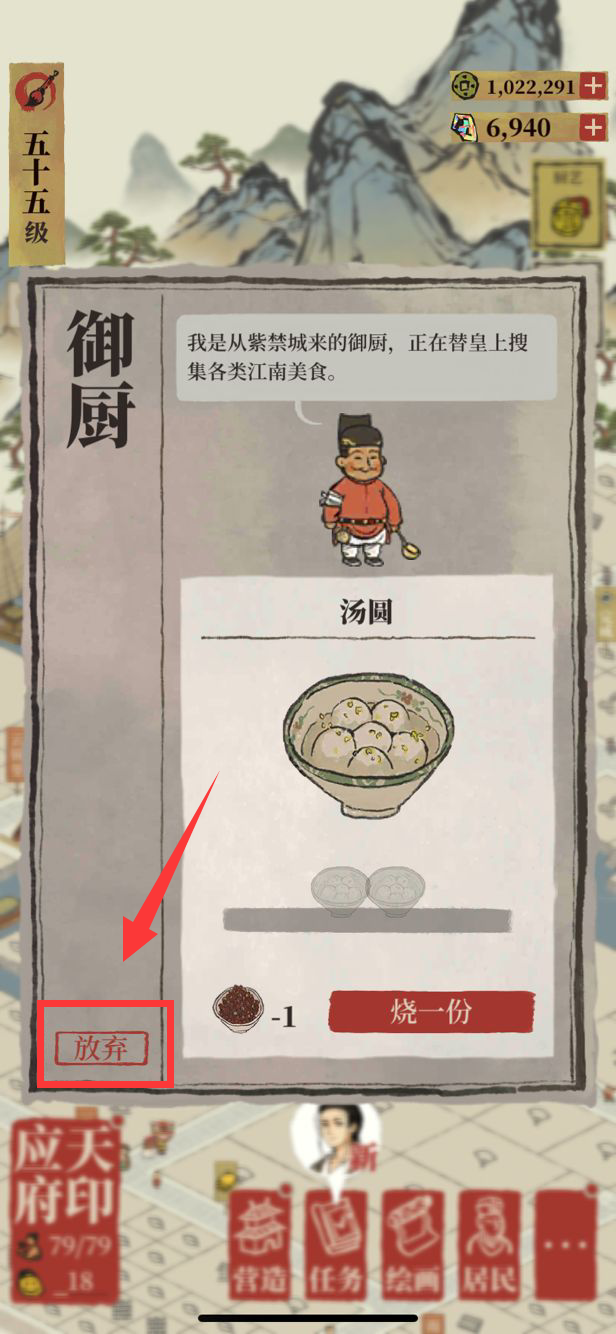 点击左下角的放弃图标,就能放弃此次的任务了,放弃本轮的菜品,放弃后10分钟后会刷新下一道菜品。