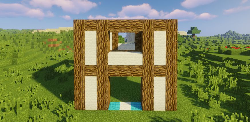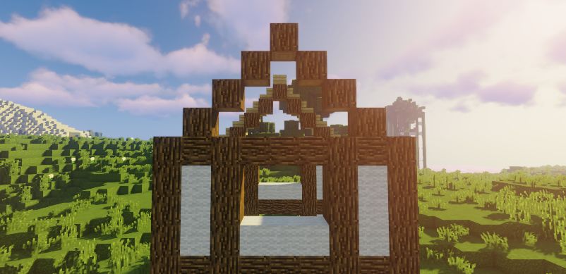 再使用橡木原木,如图叠加至8层高,再连接起来。