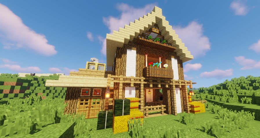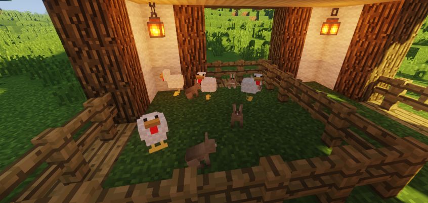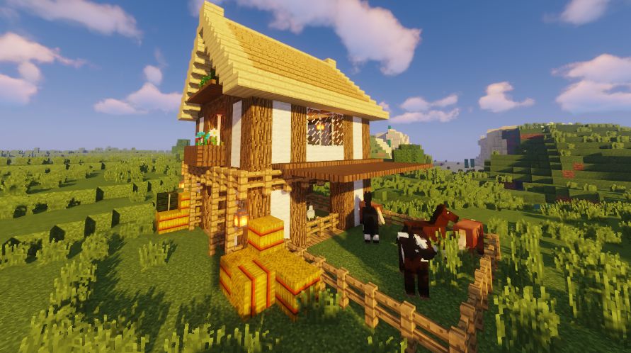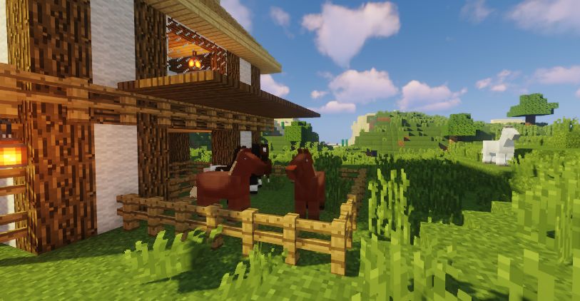 在农舍的另一侧,使用栅栏再围出一个区域,养马、牛等大型动物。使用活板门给它们搭建个挡雨的棚子吧。
