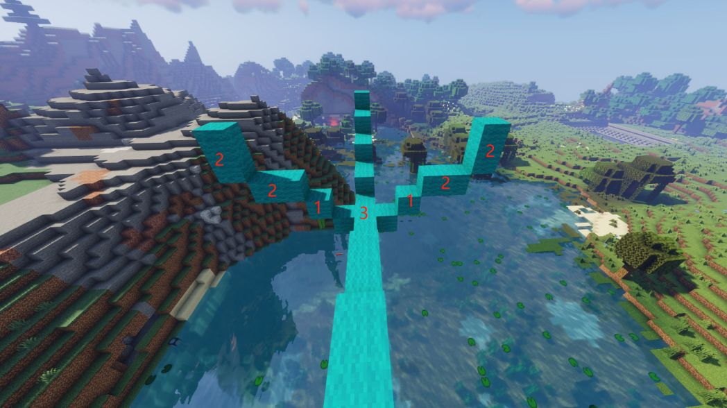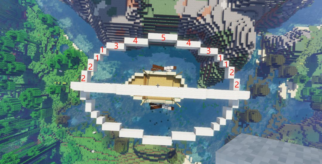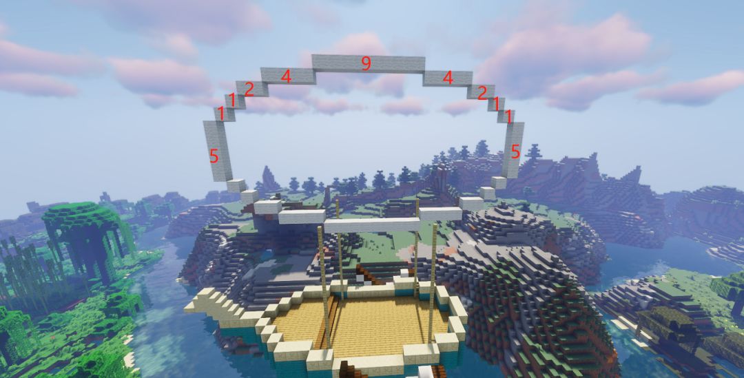 在船中的四个角落用白桦木栅栏,搭建高为13格的吊索,然后找到四根吊索的中点,找到中点往上11格的位置。